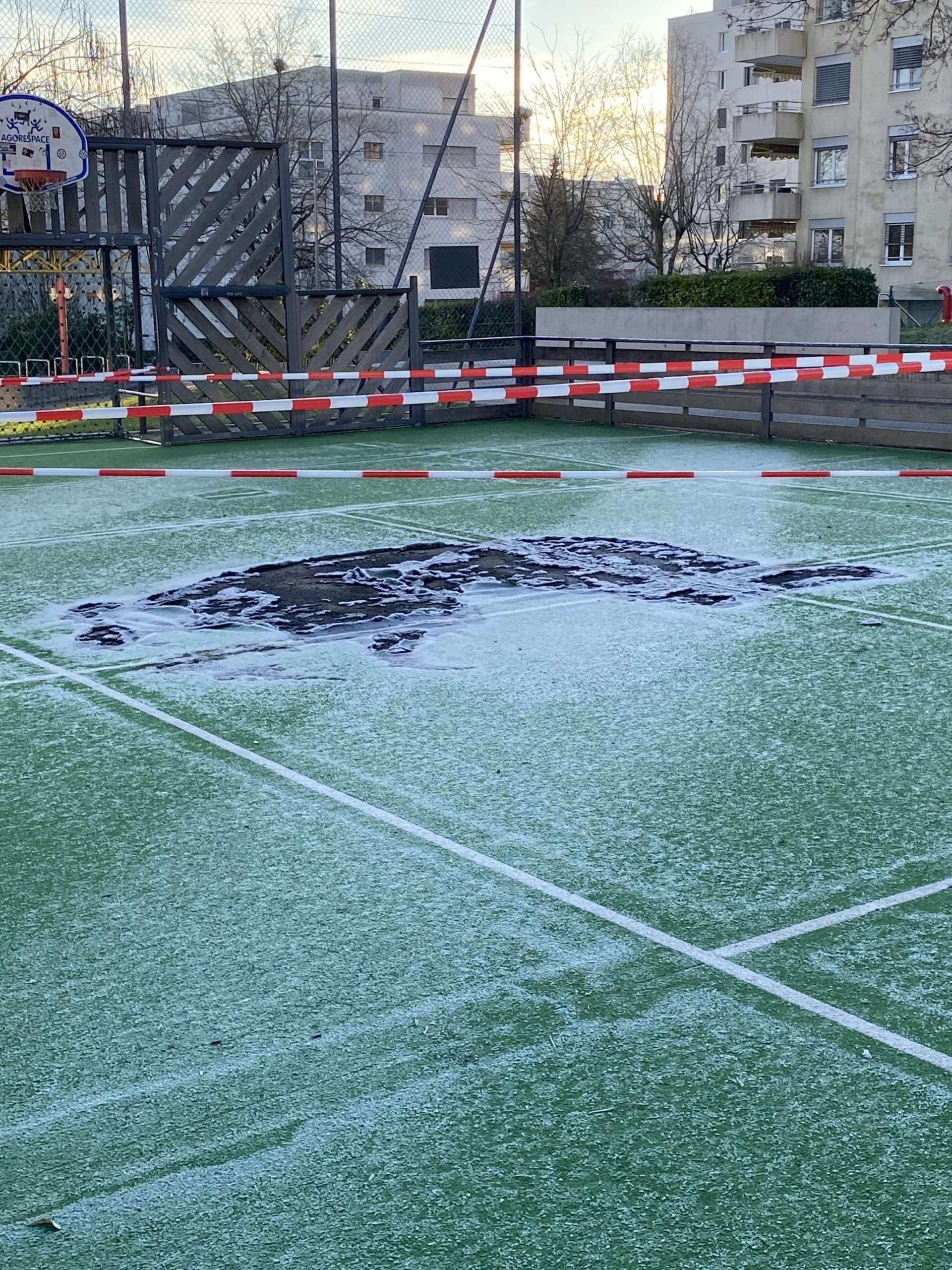 Voici le terrain de jeu Agora de l’école Ami-Argand au matin de ce triste premier Janvier 2026 après un tir de feux d’artifices.
